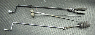 One tip to cleaning the cams is to thread each one onto a wire. This way they will stay in order, and you can soak all of them at once. Thanks to Bill Spurling for that one. I like this photo. This is the rear set of cams (indicated by different color wire) Looks like some kind of spinal column. Yes, it is the spinal column of language, the printed word, modern civilization... the backbone of the "art preservative of all other arts..." wooo. Believe me, after cleaning 90 keys over an open tub of white gas, you'll be allowing your mind to flutter off to these fun thoughts as well.